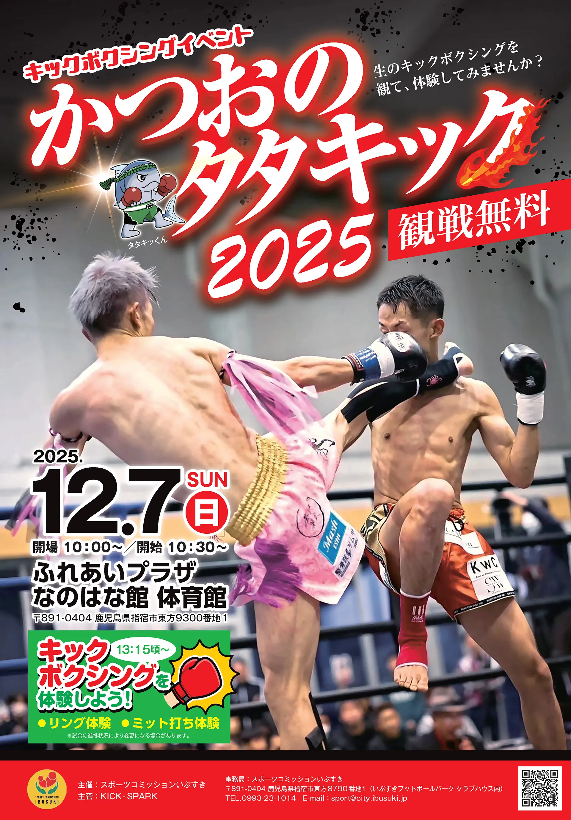 生のキックボクシングを観て、体験してみませんか?スポーツコミッションいぶすき主催、KICK・SPARK主管によるキックボクシングイベント「かつおのタタキック2025」が開催されます。観戦は無料ですので、ぜひこの機会に迫力満点のキックボクシングをご覧ください!